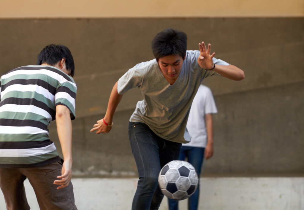 Young Asian males playing soccer outside.